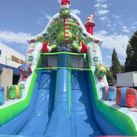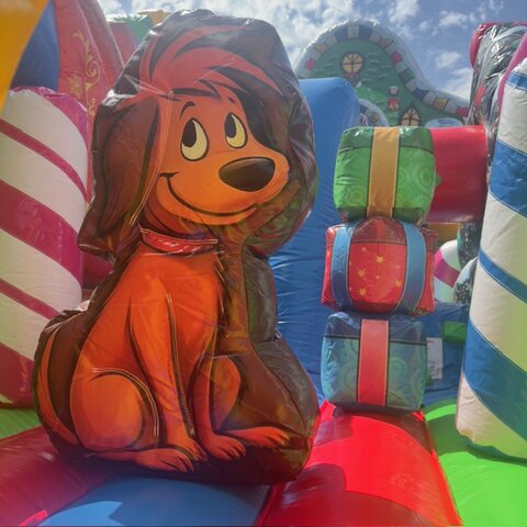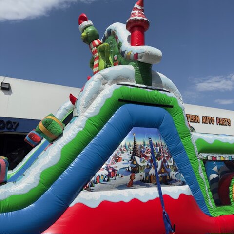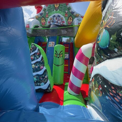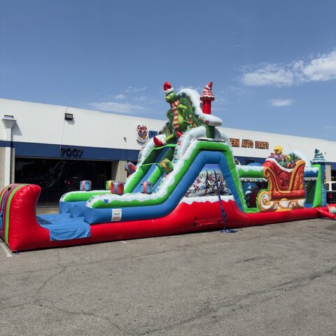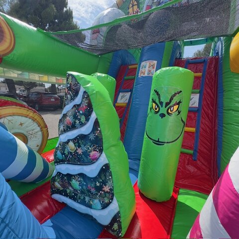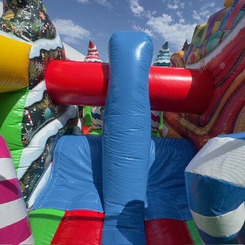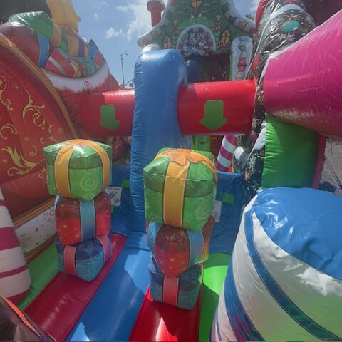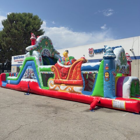 Our very popular NEW 50' Christmas Obstacle Course is for sure a must have for all Christmas Holiday Events. Great for city events, church and schools. This 50' Christmas Obstacle Course is a 2 person race at a time that includes pop-ups, mini slide inside tunnels and a larger ladder and slide at the end that ends the race. This Christmas Obstacle Course has very fine details all around showing holiday themed Christmas trees and houses, large Green Santa sitting ontop of the slide and Holiday decorations all the way around.